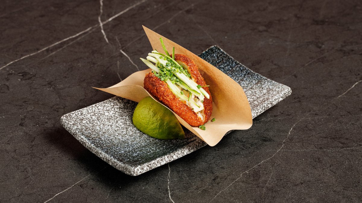 Καραμελωμένες μπουκίτσες τηγανητής γαρίδας* με spicy mayo sauce, lime και σχοινόπρασο
