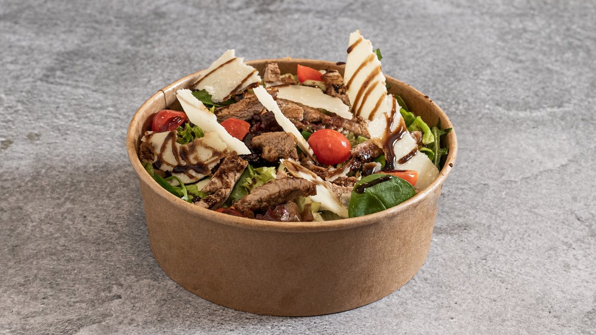 Σαλάτα με ανάμεικτα λαχανικά, μοσχαρίσια φιλετάκια, ντοματίνια, flakes παρμεζάνας και dressing βαλσάμικο