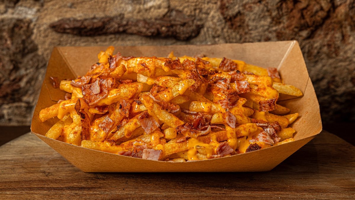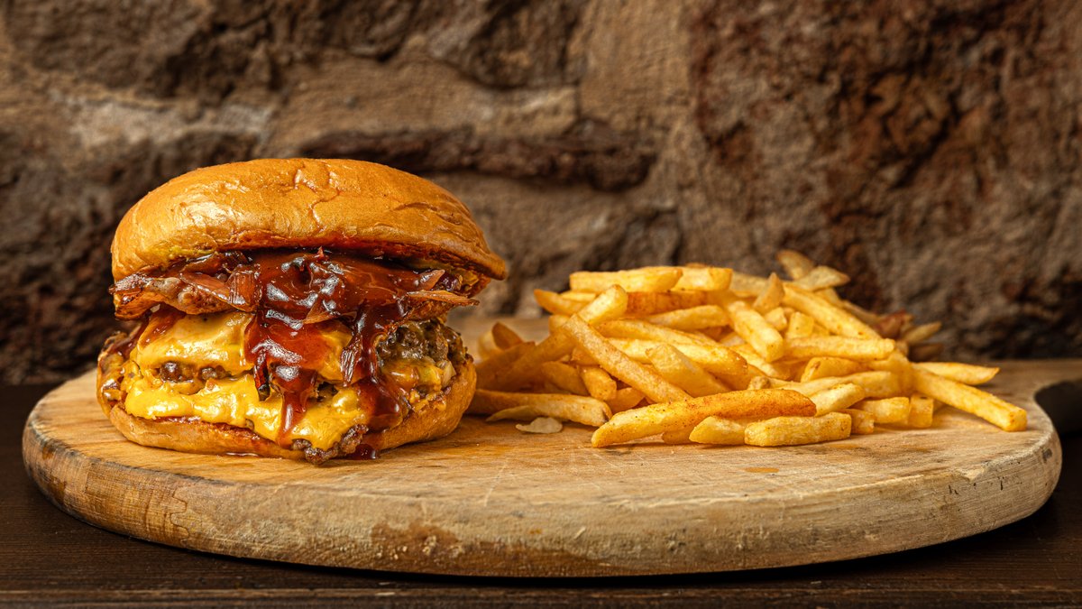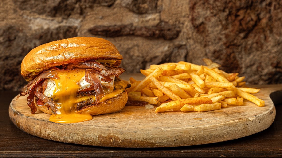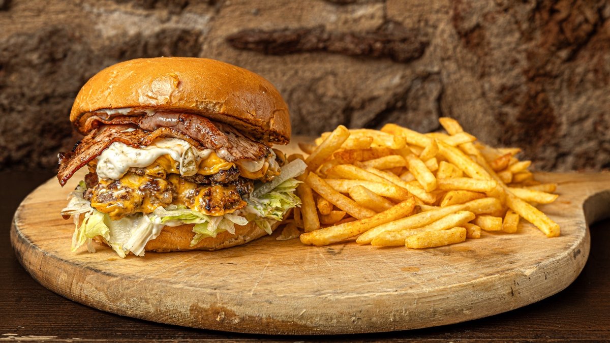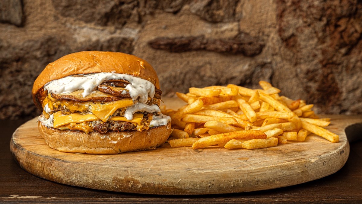 Διπλό Smash Dry Aged μπιφτέκι μοσχαρίσιο, διπλό cheddar cheese, καπνιστό bacon, καραμελωμένα κρεμμύδια, τηγανιτό αυγό, σως Smoked Mayo