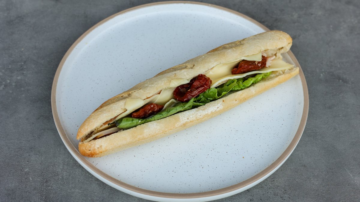Με edam, μπριζόλα καπνιστή, λιαστή ντομάτα, μαρούλι και μαγιονέζα