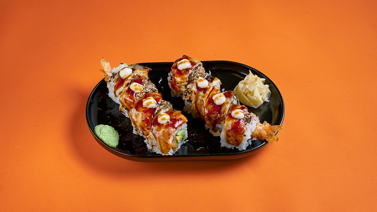 Γαρίδα tempura, αβοκάντο, χέλι, garlic mayo & teriyaki sauce