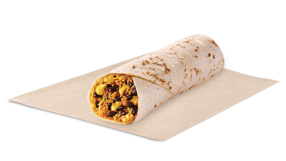 Μαύρα φασόλια, ρύζι με καρυκεύματα, ζεστή nacho cheese sauce,τριμμένα nacho chips και τυρί cheddar τυλιγμένα σε ψημένη τορτίγια αλευριού.