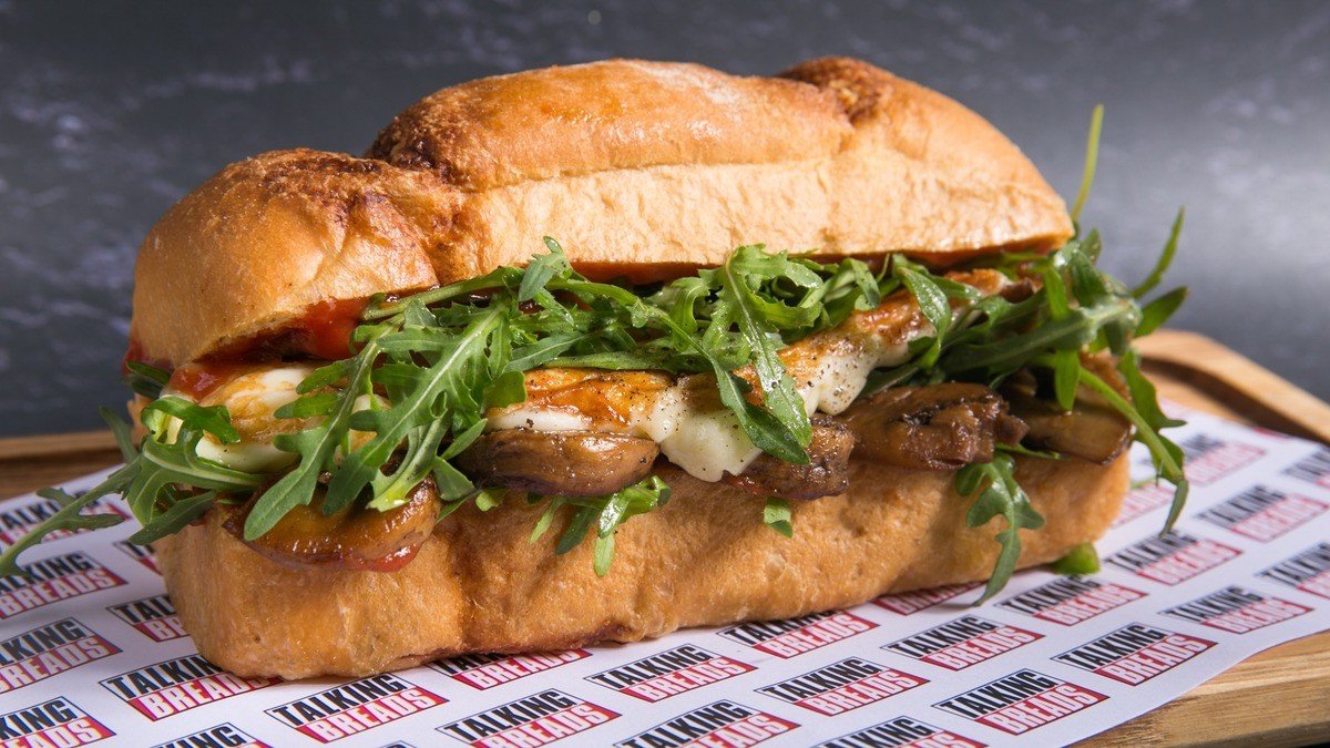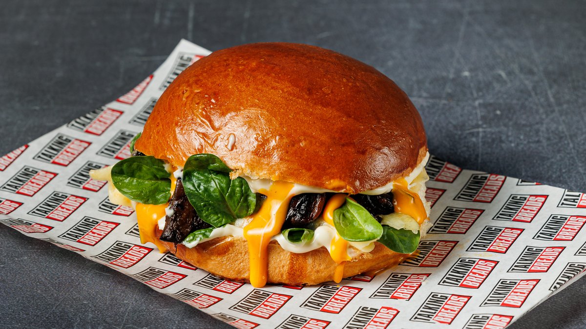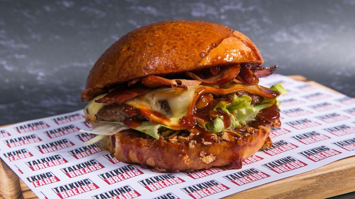 Με χειροποίητο ψωμάκι μπριός, μοσχαρίσιο μπιφτέκι, διπλό τσένταρ, μανιτάρια, μπέικον, καραμελωμένο κρεμμύδι, iceberg και σως talking bread