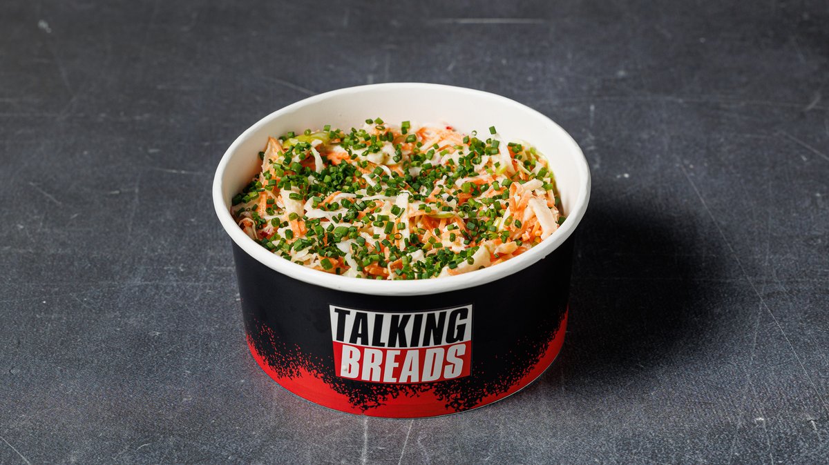 Με λάχανο, καρότο, ραπανάκι, σέλερι, πράσινο μήλο, σχοινόπρασο, dressing από μαγιονέζα και γιαούρτι