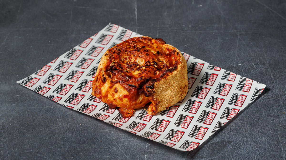 Χειροποίητο ψωμάκι βουτύρου με mild-spicy sauce ντομάτας, χαλούμι, αγγούρι, πιπεριές και καραμελωμένο κρεμμύδι.
