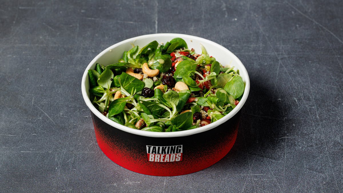 Με κινόα, βαλεριάνα, κάσιους, φυστίκια, cranberries, goji berries, πιπεριές, ντοματίνια και ντρέσινγκ από λευκό βαλσάμικο