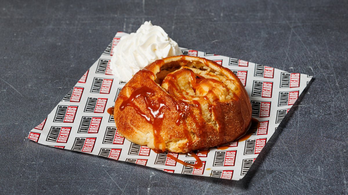 Με κρέμα, καραμελωμένα μήλα, σταφίδες, σάλτσα καραμέλας και σπιτική σαντιγύ