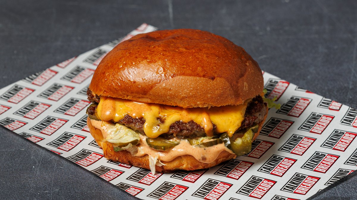 Με χειροποίητο ψωμάκι μπριός, διπλό μοσχαρίσιο μπιφτέκι, διπλό τσένταρ, iceberg, πίκλες και σως talking breads