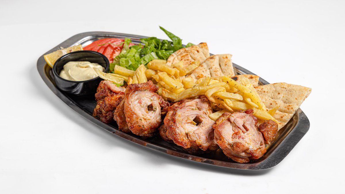 For 2 people. With 2 chicken schnitzels, 2 chicken drumsticks, 2 chicken wings, 4 chicken nuggets, and 4 chicken crispy strips. Served with fresh French fries, coleslaw, 2 pitas, and 1 sauce of your choice (180ml)