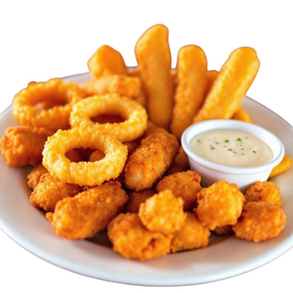 8 pieces. Pan-fried chicken breast nuggets. Served with fresh French fries, cabbage and carrot salad, pita, and sauce of your choice (75 ml).