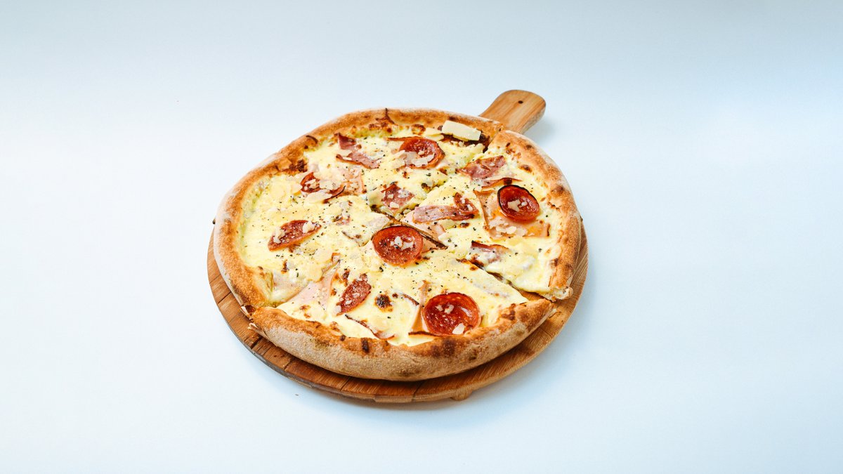33 cm. Με κρέμα παρμεζάνας, mozzarella, γαλοπούλα, bacon, pepperoni, flakes παρμεζάνας και φρεσκοτριμμένο πιπέρι
