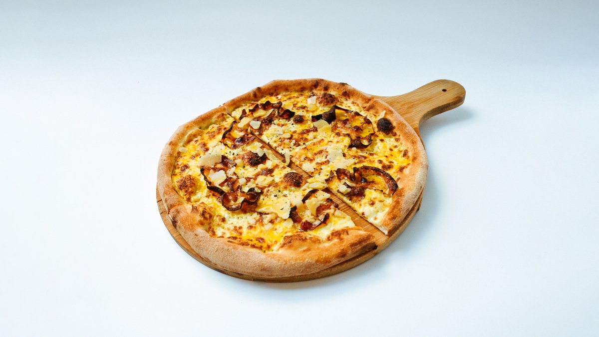 33 cm. Με κρέμα παρμεζανας, guanciale, κρόκο αυγού, flakes παρμεζάνας, mozzarella και φρεσκοτριμμένο πιπέρι