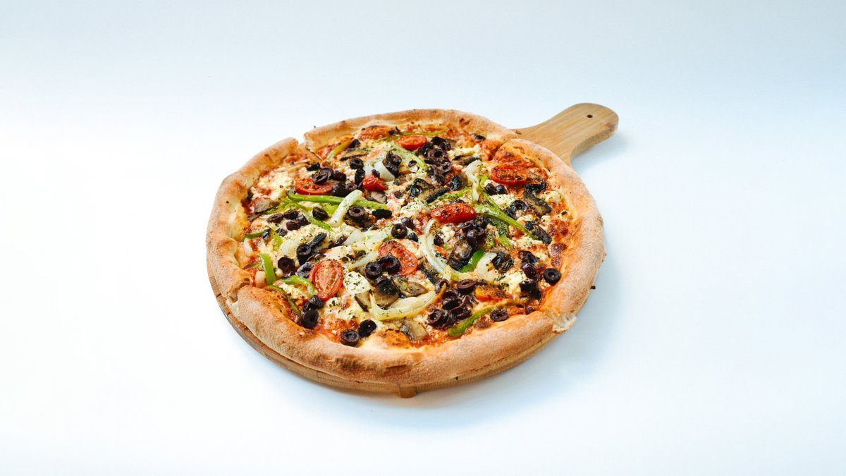 33 cm. Με σάλτσα san marzano, πράσινη πιπεριά, κρεμμύδι, φέτα, ελιές, ντοματίνια και ρίγανη