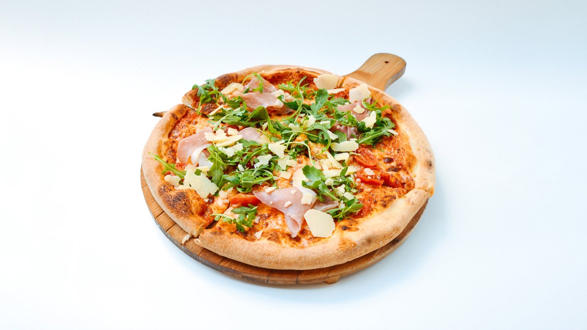 33 cm. Με σάλτσα san marzano, ντοματίνι, prosciutto di parma, ρόκα και flakes παρμεζάνας