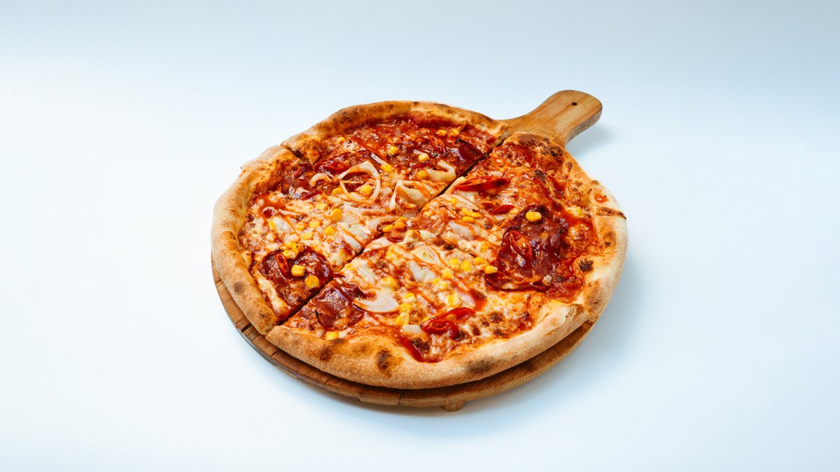 33 cm. Με σάλτσα san marzano, mozzarella, sriracha, mozzarella, πιπεριά τσίλι, spianata piccante, καλαμπόκι και κρεμμύδι