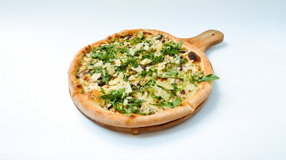 33 cm. Με κρέμα τρούφας, mozzarella, μανιτάρια ,flakes παρμεζάνας, ρόκα, λάδι τρούφας, και φρεσκοτριμμένο πιπέρι