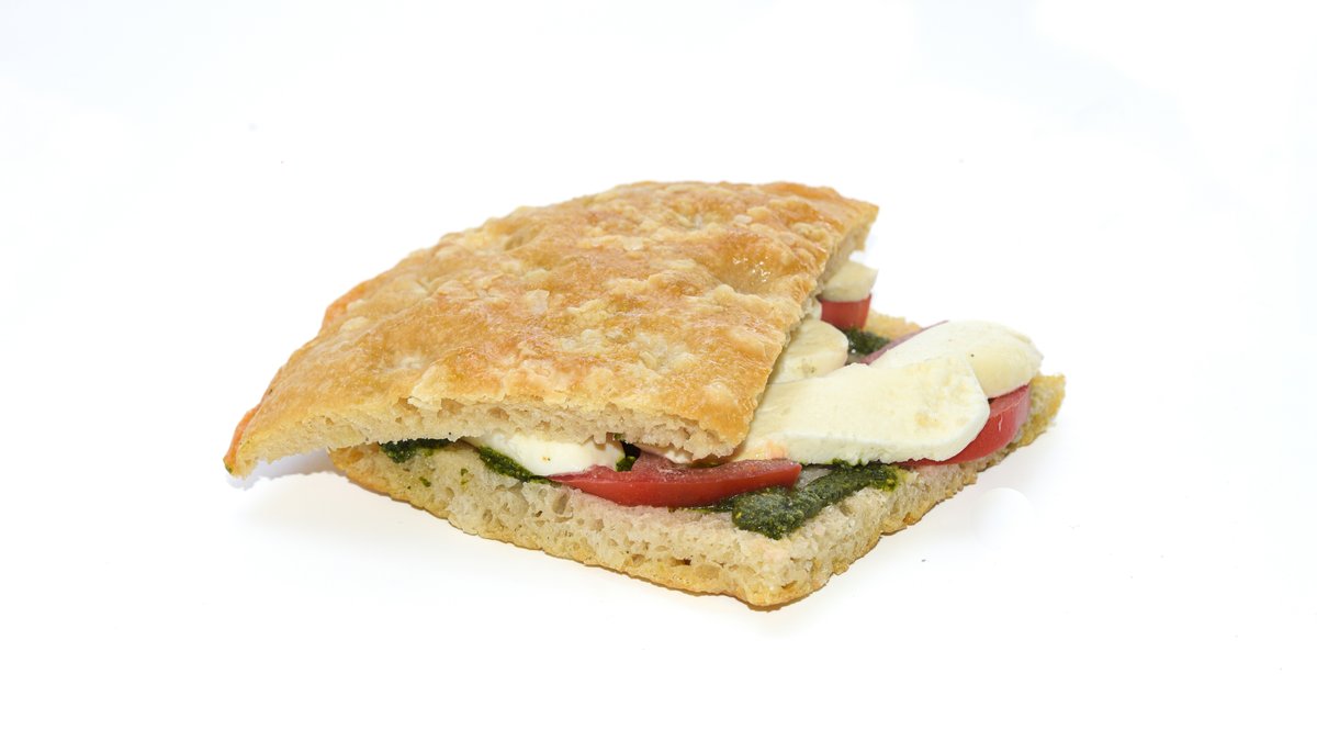Με mozzarella fior di latte, pesto βασιλικού και ντομάτα