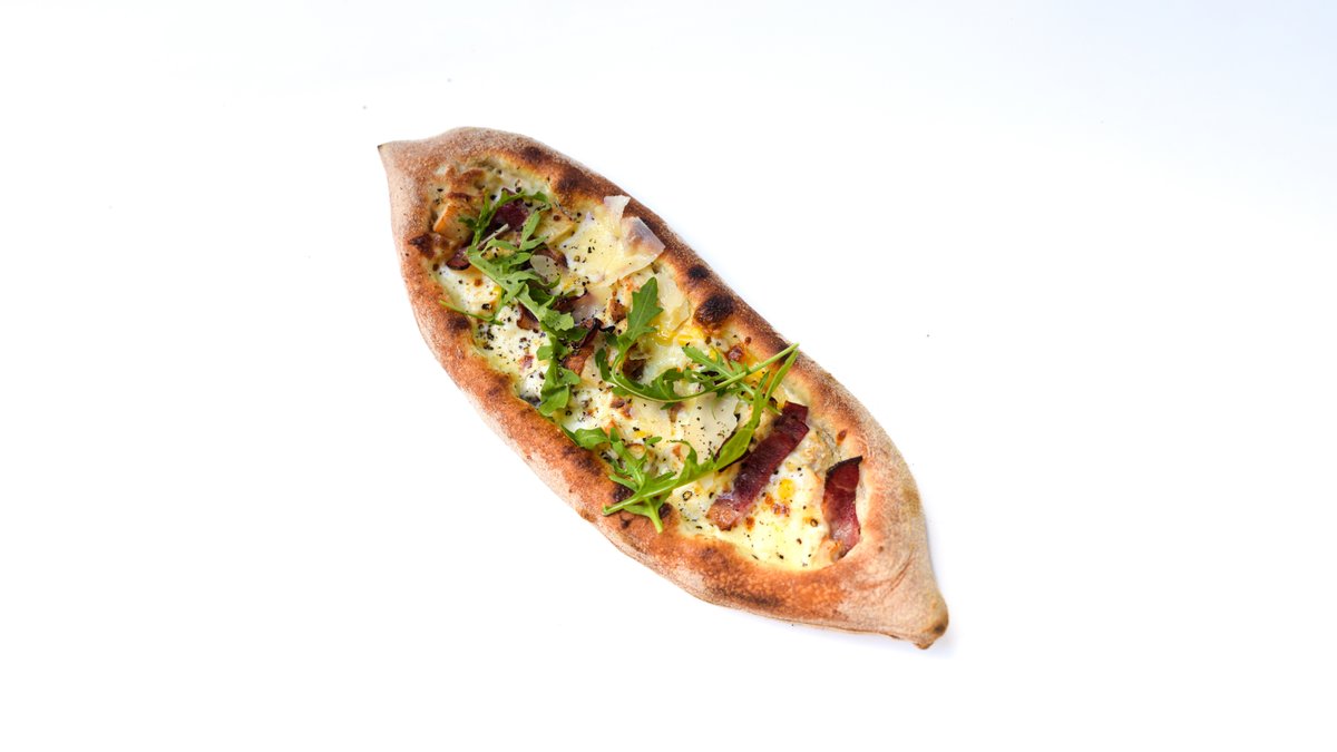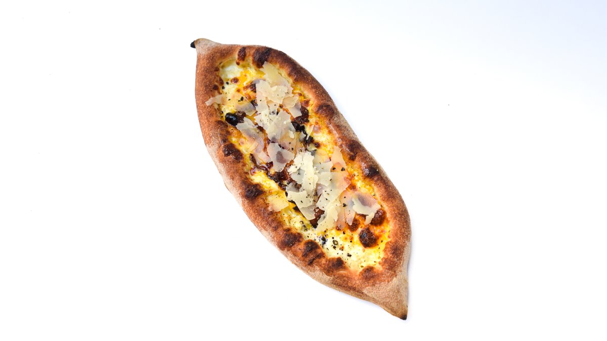 Με κρέμα παρμεζανας, guanciale, κρόκο αυγού, flakes παρμεζάνας, mozzarella και φρεσκοτριμμένο πιπέρι