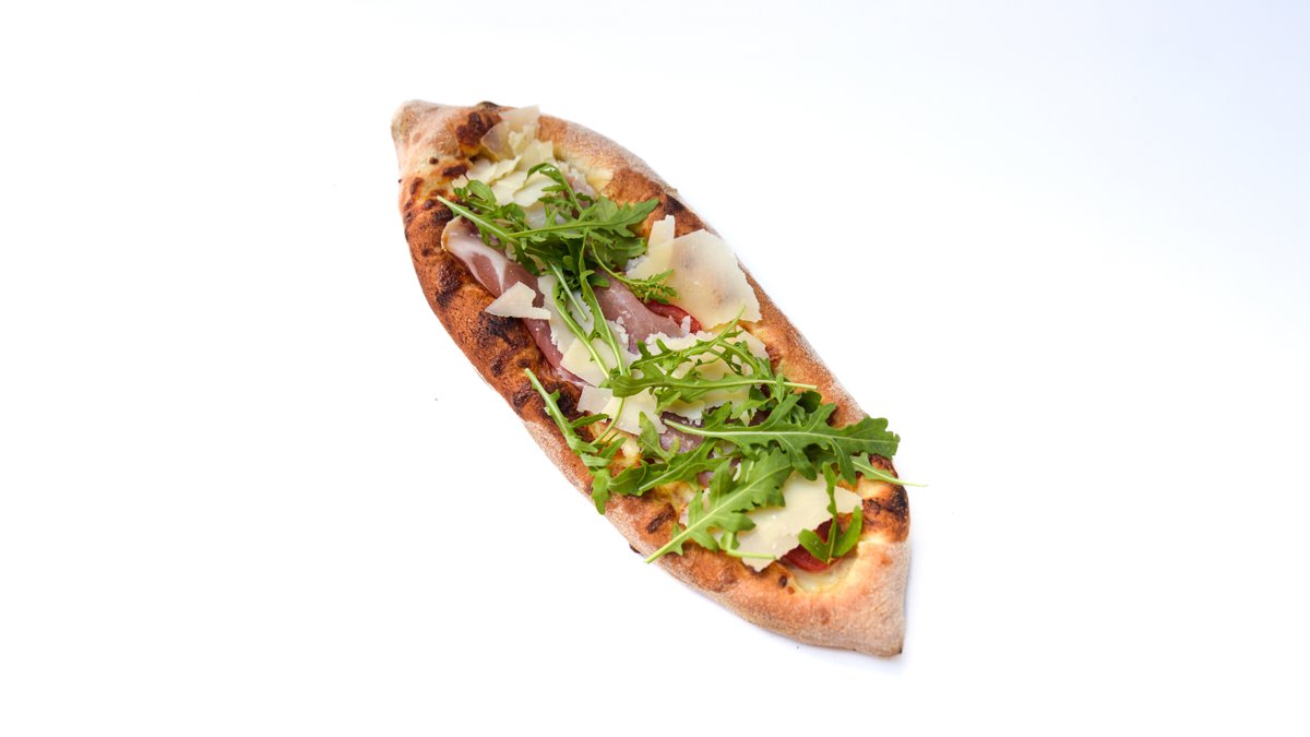 Με σάλτσα san marzano, ντοματίνι, prosciutto di parma, ρόκα και flakes παρμεζάνας