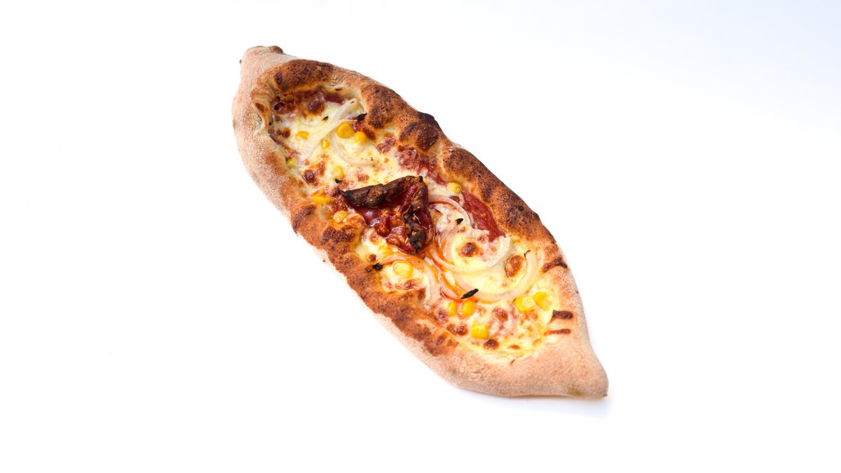 Με σάλτσα san marzano, mozzarella, sriracha, mozzarella, πιπεριά τσίλι, spianata piccante, καλαμπόκι και κρεμμύδι