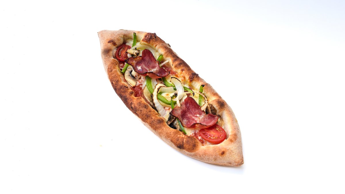 Με σάλτσα san marzano, mozzarella, πράσινη πιπεριά, bacon, μανιτάρι, κρεμμύδι και ντοματίνι