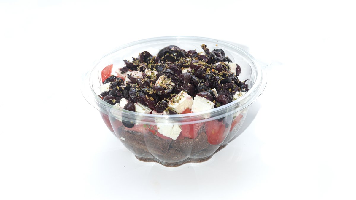 Με παξιμάδι χαρούπι, κάππαρη, ντοματίνι, φέτα, ελαιόλαδο, ρίγανη και αλάτι