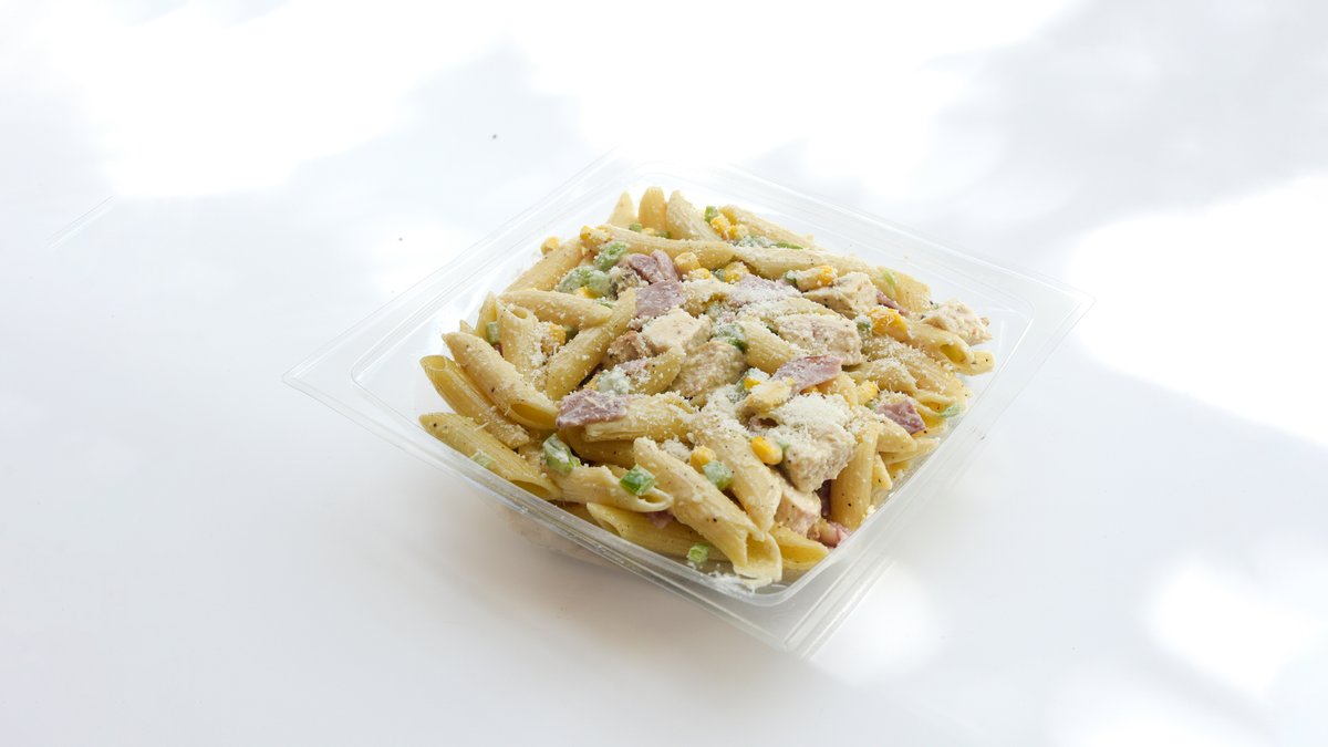 Με Caesar's dressing, παρμεζάνα, bacon, κοτόπουλο, πράσινη πιπεριά και καλαμπόκι