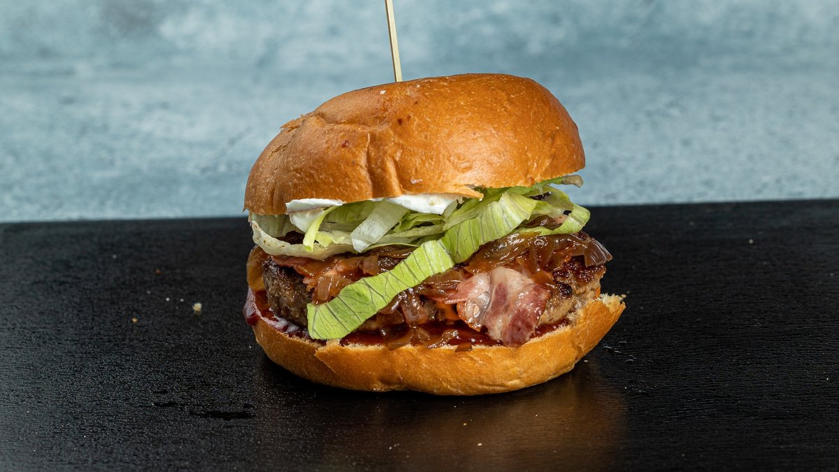 Ψωμάκι της επιλογής σου με χειροποίητο μοσχαρίσιο μπιφτέκι 200 g της επιλογής σου, cheddar, μπέικον, καραμελωμένα κρεμμύδια, πίκλες, μαρούλι, κρέμα τυριών και mayo BBQ sauce