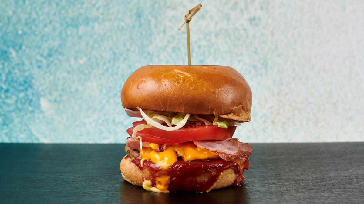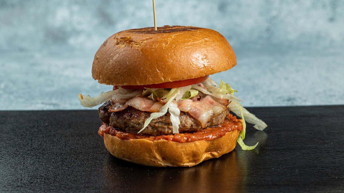 Ψωμάκι της επιλογής σου με χειροποίητο μοσχαρίσιο μπιφτέκι 200 g της επιλογής σου, cheddar, μπέικον, ντομάτα, iceberg, μαγιονέζα, μουστάρδα και ketchup