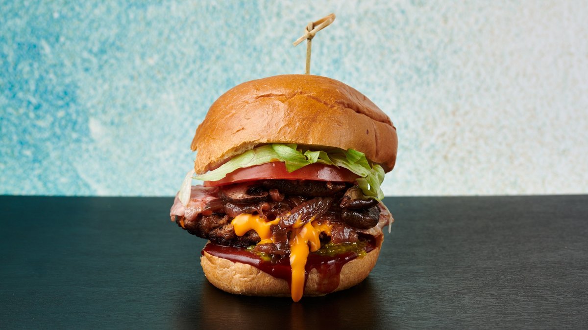 Ψωμάκι της επιλογής σου με χειροποίητο μοσχαρίσιο μπιφτέκι 200 g της επιλογής σου, cheddar, καπνιστό μπέικον, σωταρισμένα μανιτάρια, ντομάτα, iceberg, μαγιονέζα και sauce BBQ