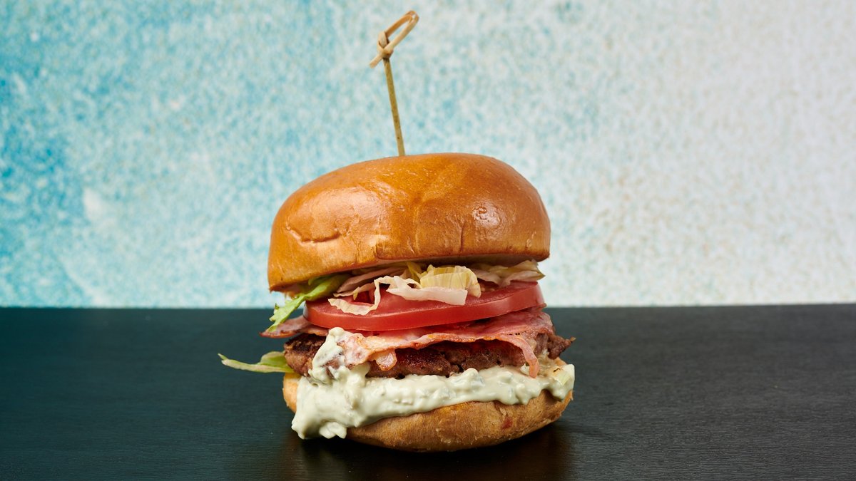 Ψωμάκι της επιλογής σου με χειροποίητο μοσχαρίσιο μπιφτέκι 200 g της επιλογής σου, blue cheese mayo, μπέικον, ντομάτα και iceberg