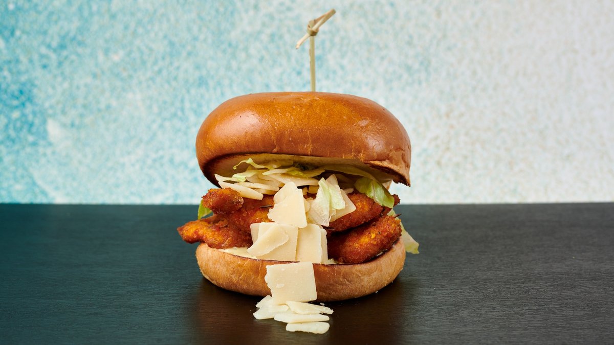 Ψωμάκι της επιλογής σου με τραγανό κοτόπουλο πανέ, flakes παρμεζάνας, πίκλες, ντομάτα, iceberg και BBQ sauce