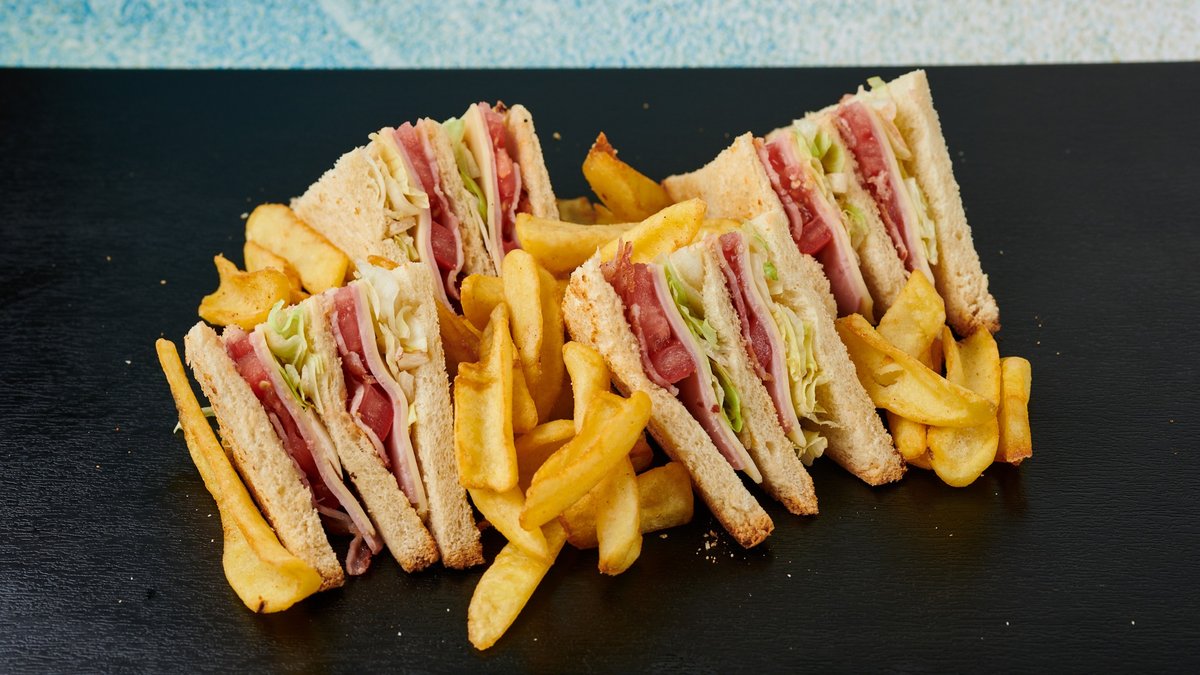 Με ζαμπόν, μπέικον, τυρί, ντομάτα, μαρούλι και μαγιονέζα. Συνοδεύεται από πατάτες τηγανητές