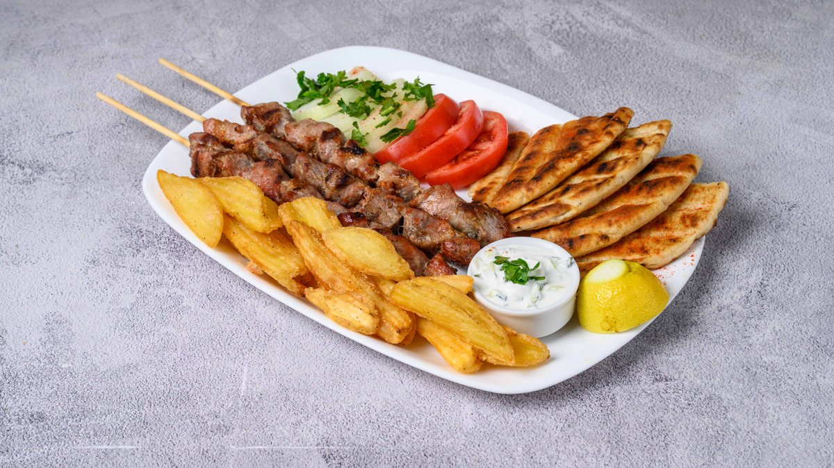 Με 1 καλαμάκι κοτόπουλο, 1 καλαμάκι χοιρινό, 1 κεμπάπ και 1 λουκάνικο χωριάτικο. Συνοδεύεται από πατάτες τηγανητές, ντομάτα, κρεμμύδι, μαρούλι, πίτα, σως μουστάρδας και τζατζίκι