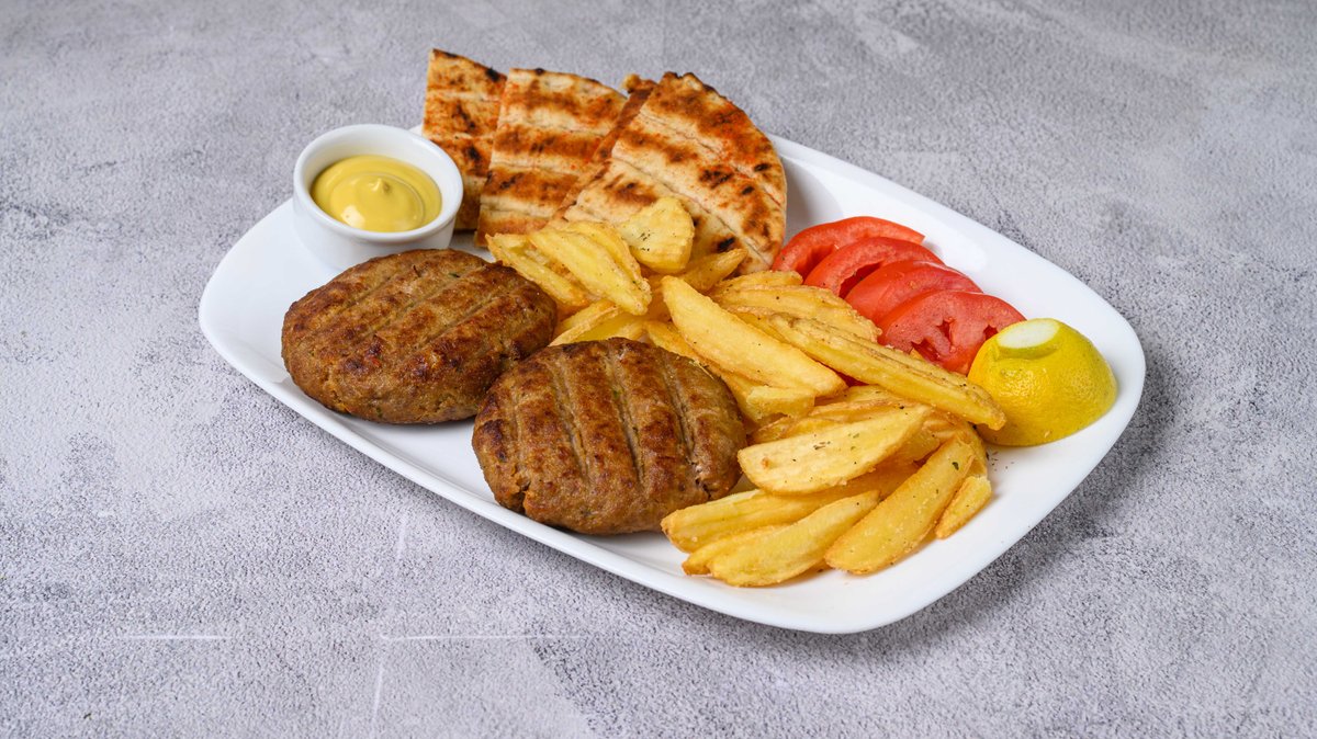 2 Τεμάχια. Συνοδεύεται από πατάτες τηγανητές, ντομάτα, κρεμμύδι, σως μουστάρδας και πίτα