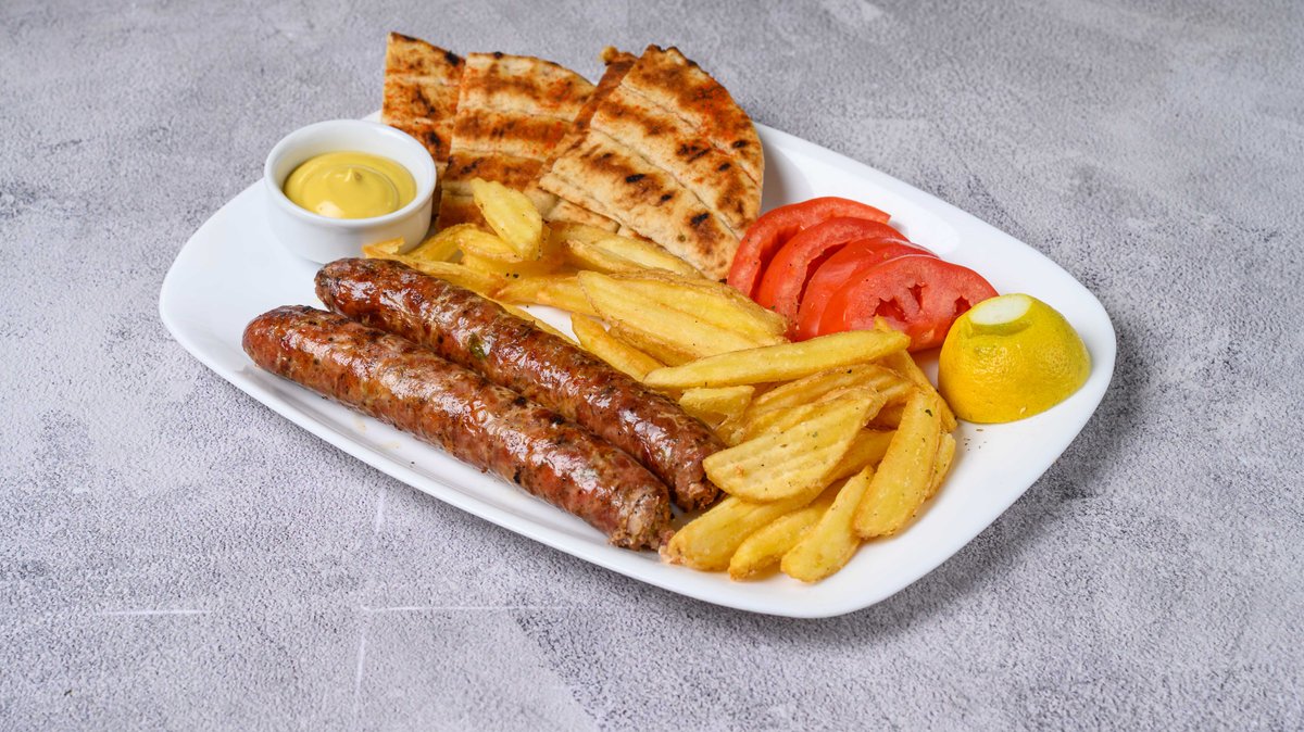 Συνοδεύεται από πατάτες τηγανητές, ντομάτα, κρεμμύδι, τζατζίκι και πίτα