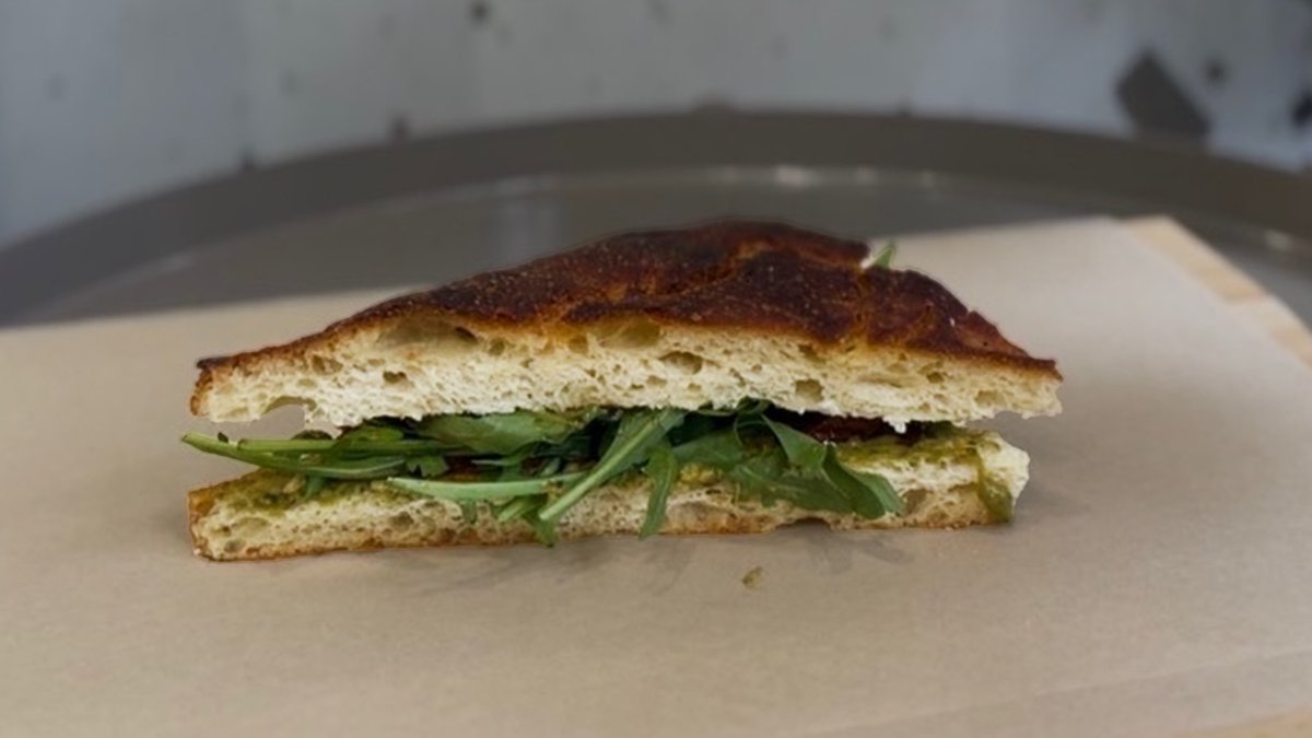 Φοκάτσια με ρόκα, βαλσαμικο ,κρέμα τυρί , λιαστή ντομάτα και vegan πέστο βασιλικού.