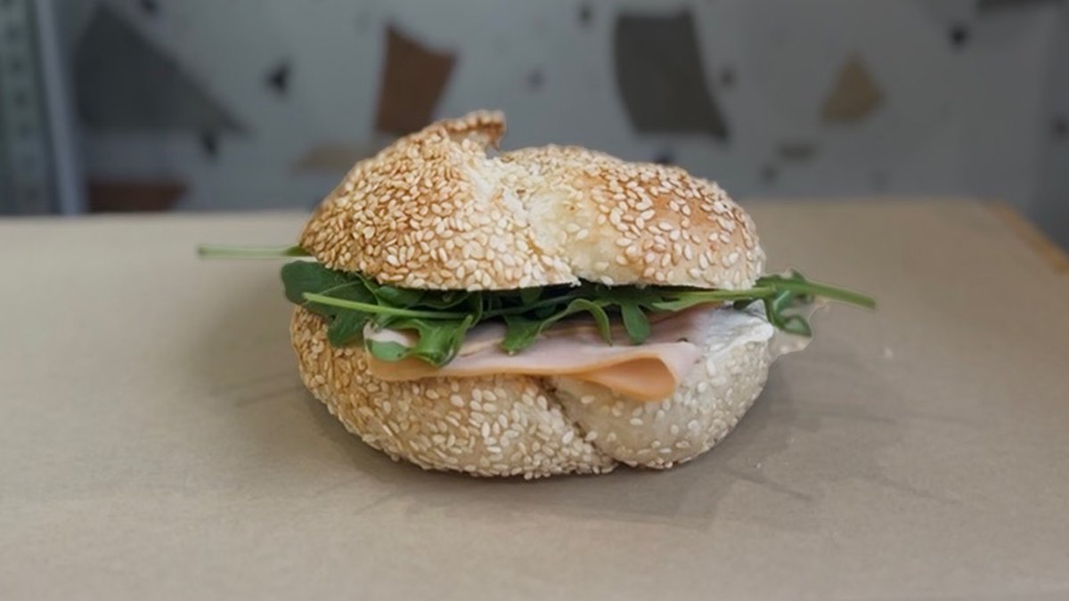 Γεμιστό κουλούρι Θεσσαλονίκη, με κρέμα τυρί, γαλοπούλα και ρόκα.