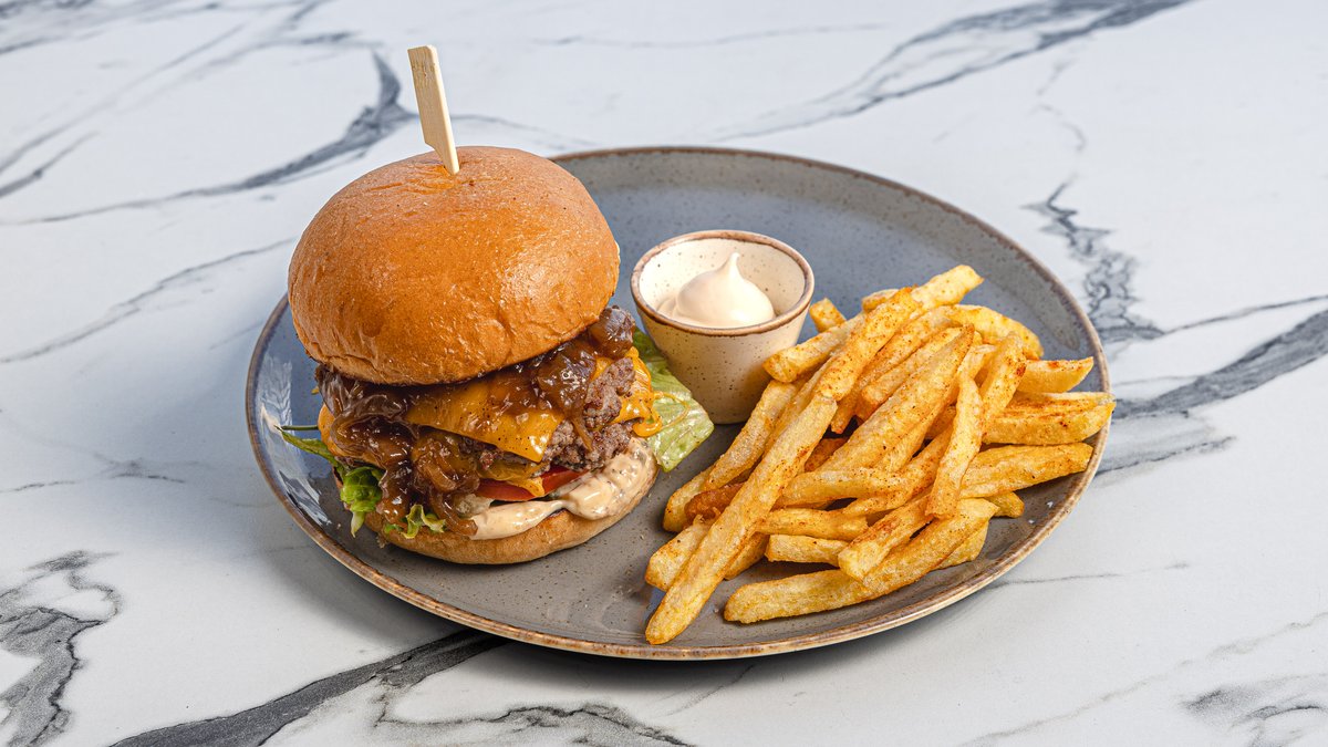 2 Μοσαχαρίσια μπιφτέκια smashed, τυρί cheddar, ντομάτα, καραμελωμένο κρεμμύδι, πράσινη σαλάτα και Umberto sauce
