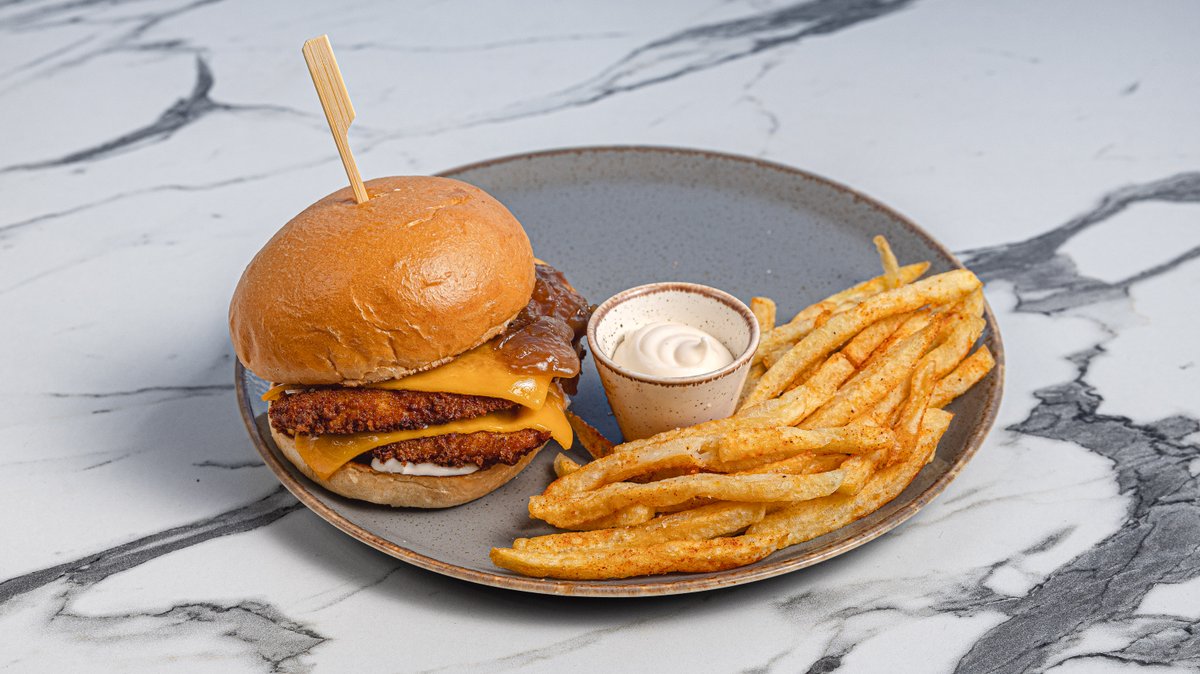 2 Κοτόπουλα πανέ, μαρμελάδα μπέικον, διπλό τυρί cheddar, καραμελωμένο κρεμμύδι, πίκλα αγγούρι και spicy mayo
