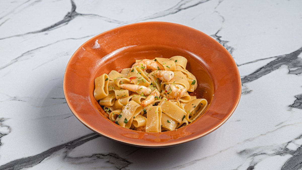 Calamarata, φρέσκιες γαρίδες, peperoncino και φρέσκο κρεμμυδάκι