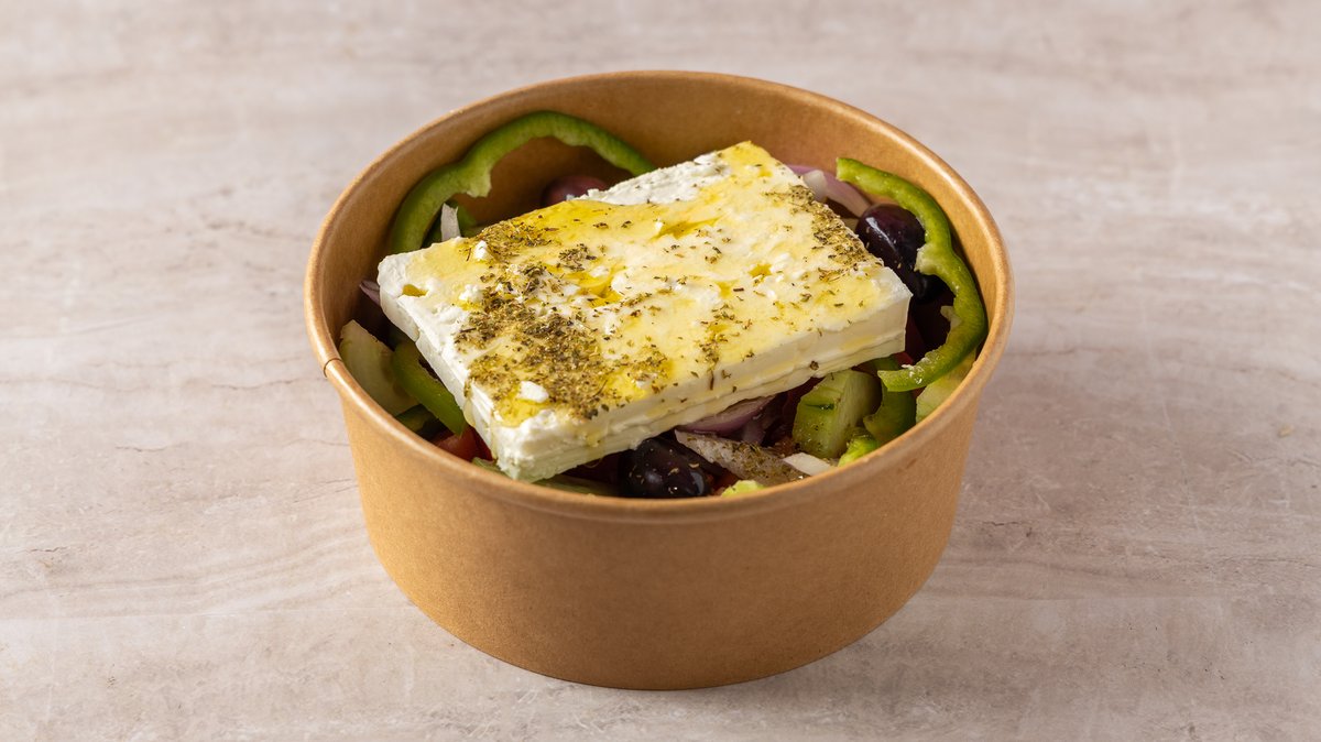 Σαλάτα με βαρελίσια φέτα, ντομάτα, αγγούρι, κρεμμύδι, ελιές, πράσινη πιπεριά και ελαιόλαδο