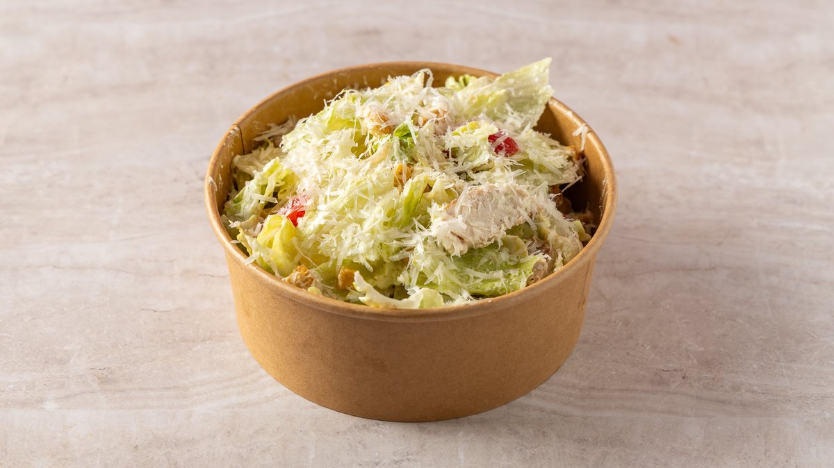 Σαλάτα με iceberg, φιλέτο κοτόπουλου, ντοματίνια, τριμμένη παρμεζάνα, χειροποίητο κρουτόν, καλαμπόκι και caesar's sauce