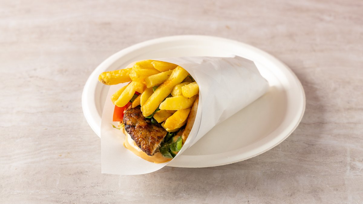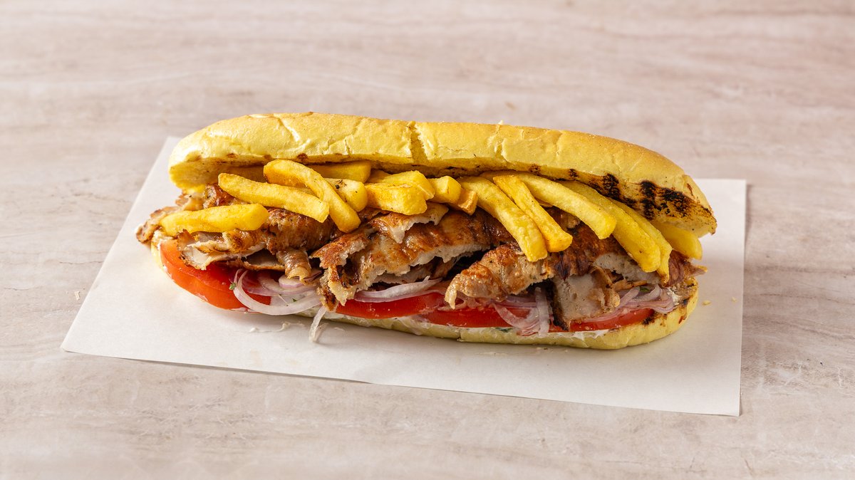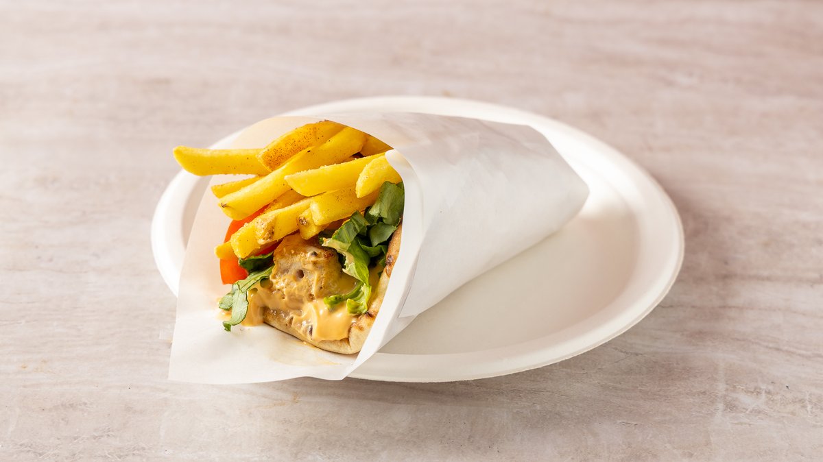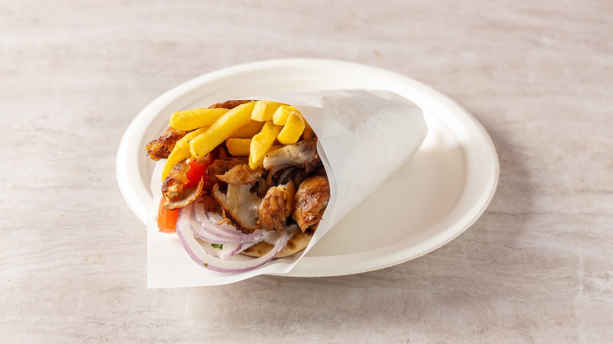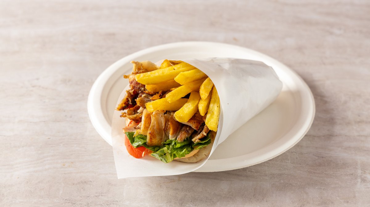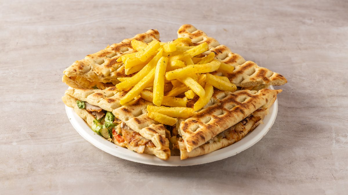 Σκεπαστή με γύρο κοτόπουλο, gouda, ντομάτα, κρεμμύδι, πατάτες και σως βεάκη. Συνοδεύεται από πατάτες τηγανητές