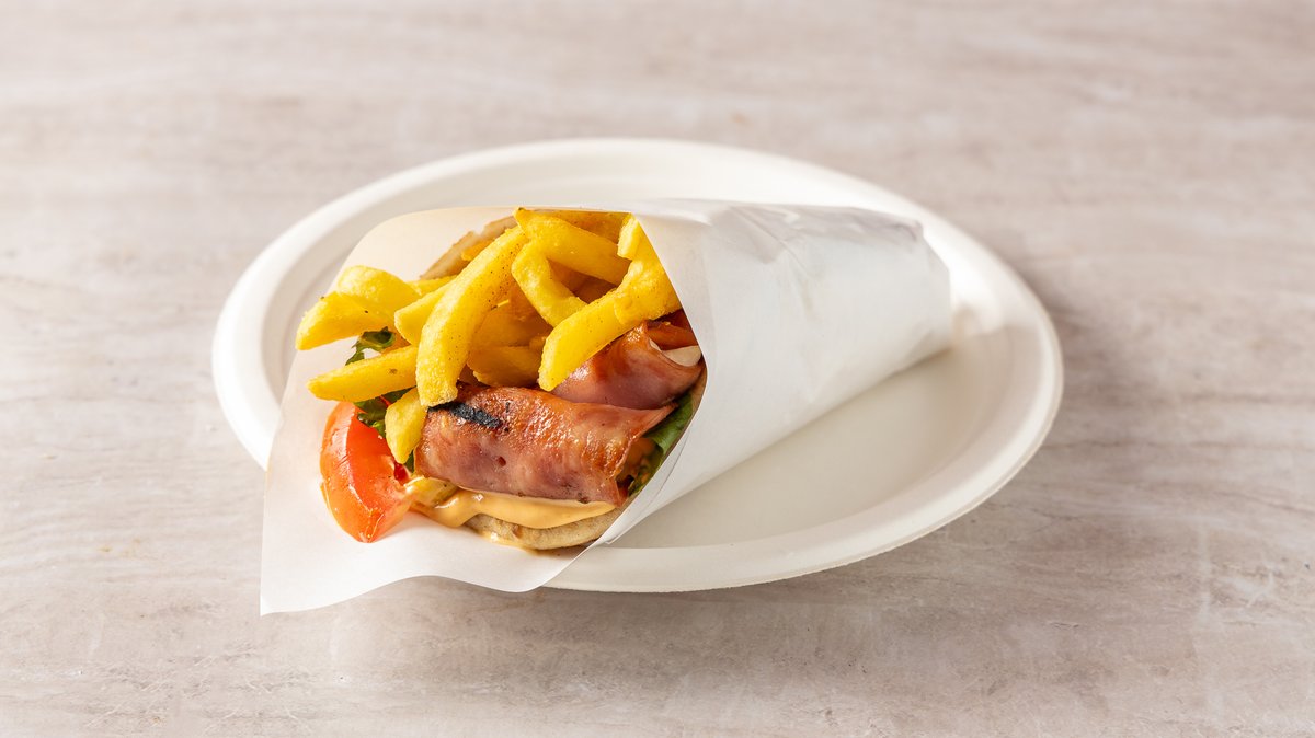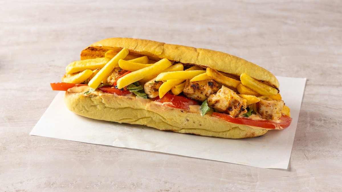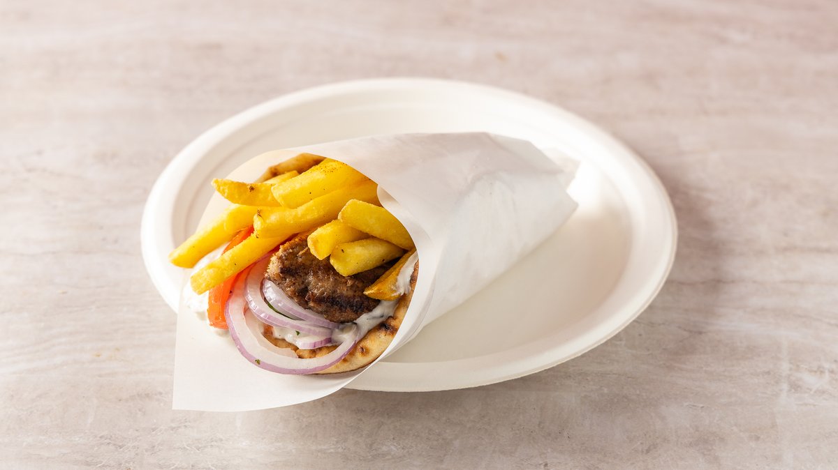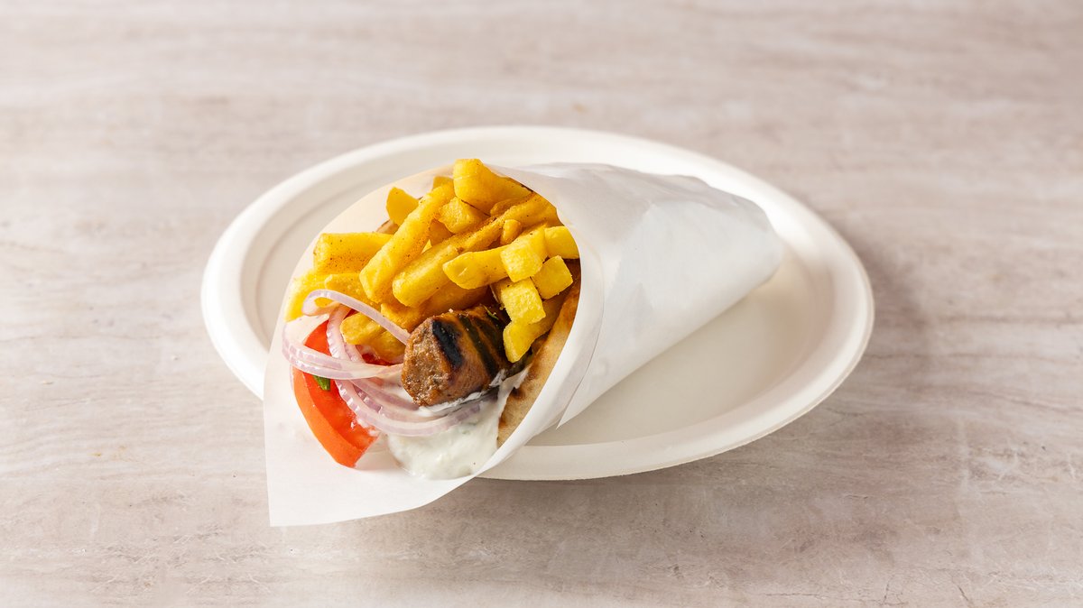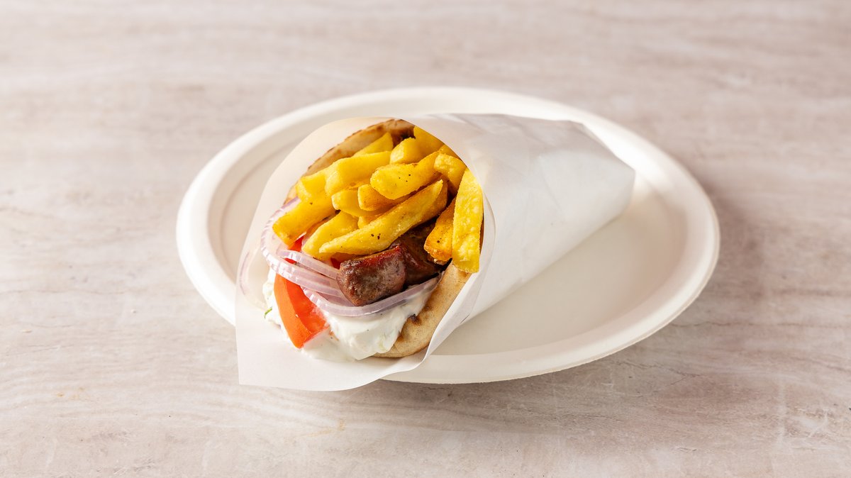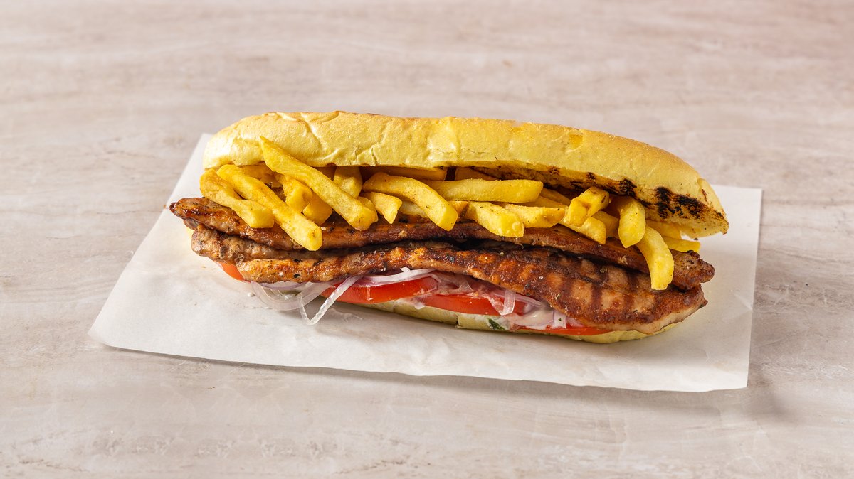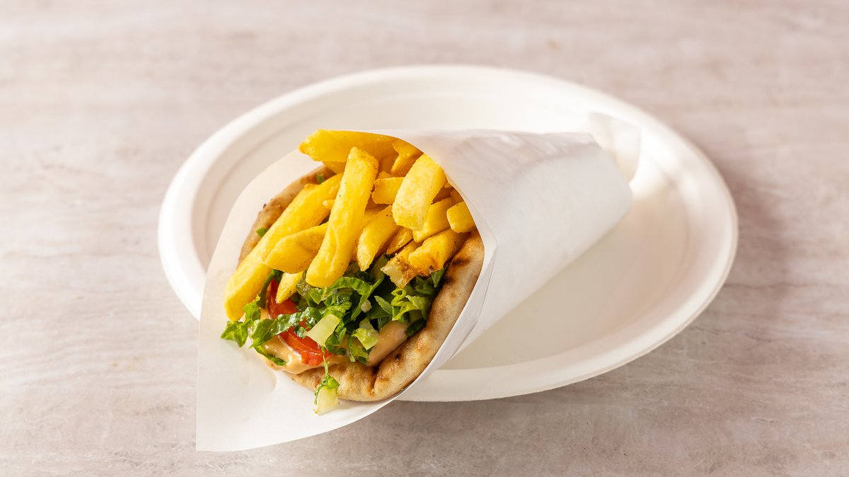 Σκεπαστή με γύρο κοτόπουλο, gouda, ντομάτα, κρεμμύδι, πατάτες και σως βεάκη. Συνοδεύεται από πατάτες τηγανητές