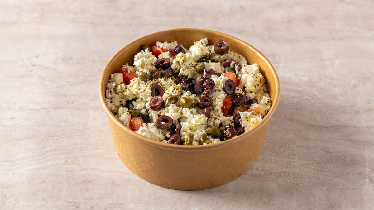 Σαλάτα με κριθαροκούλουρο, ψιλοκομμένη ντομάτα, ελιά ροδέλα, κάπαρη, μείγμα ανθότυρου με φέτα, ρίγανη και ελαιόλαδο