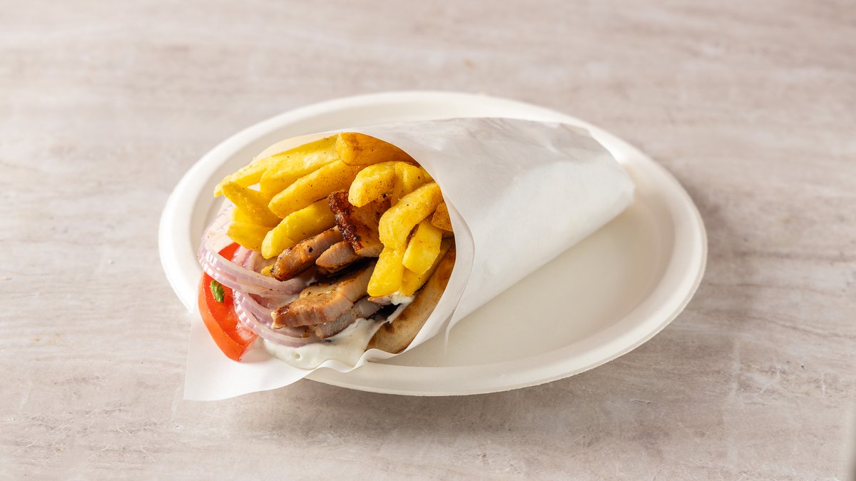 Σκεπαστή με γύρο χοιρινό, gouda, ντομάτα, κρεμμύδι, πατάτες και σως βεάκη. Συνοδεύεται από πατάτες τηγανητές