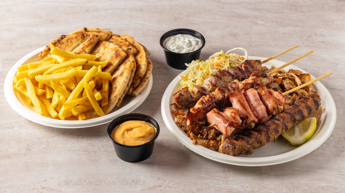 Περιλαμβάνει γύρο χοιρινό, γύρο κοτόπουλο, 1 καλαμάκι χοιρινό, 1 καλαμάκι κοτόπουλο, 1 κεμπάπ μοσχαρίσιο και 1 λουκάνικο. Συνοδεύεται από πατάτες, σαλάτα εποχής, 2 πίτες και 2 σως της επιλογής σου