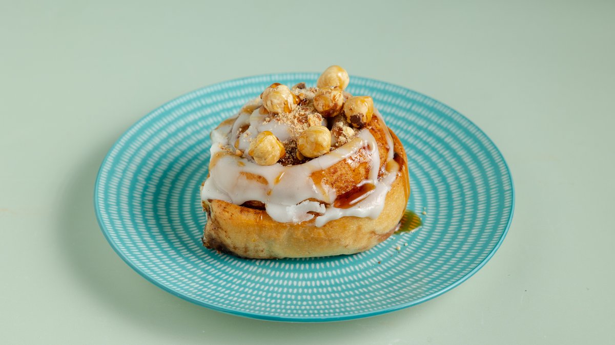 Ρολό αφράτης ζύμης με γέμιση κανέλα makara και πλούσια επικάλυψη cream cheese, πραλίνα σοκολάτας , σιρόπι σοκολάτας και τριμμένο φουντούκι