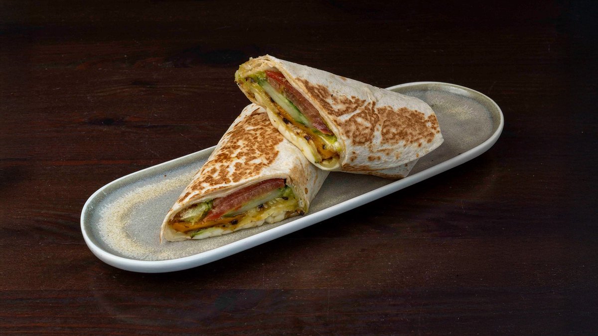 Τορτίγια με ψητά λαχανικά, σπιτικό guacamole, λόλα, ντομάτα, αγγούρι & mozzarella